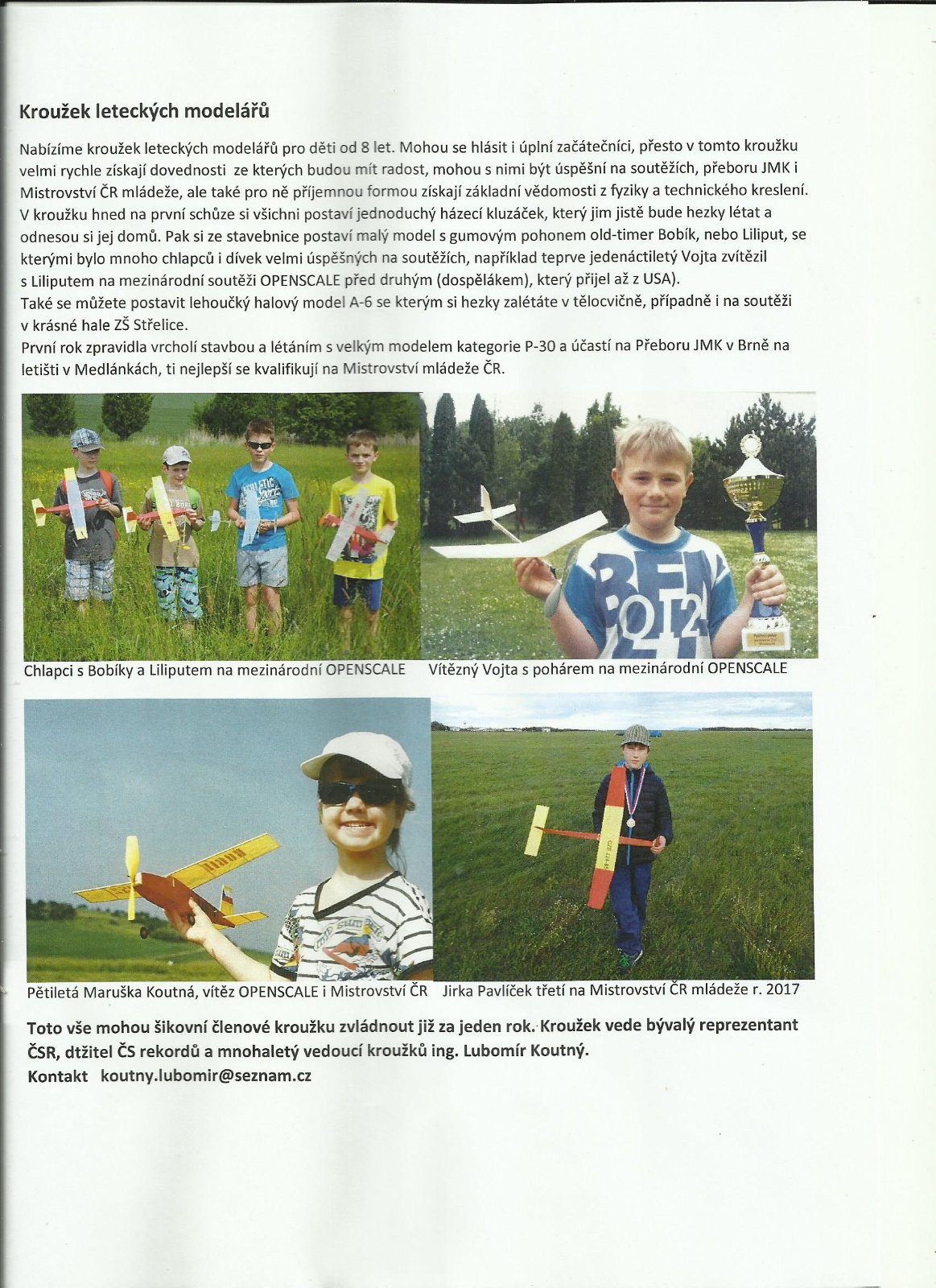 Před pár roky starostové Medlánek Filípek a po něm i Vlachová, kteří dávali poháry na naše soutěže minimaket. jako plachtaři měli zájem, aby byla nějaká mládež se zájmem o letectví a chtěli, abychom v ZŠ Hudcova Medlánky vedli modelářský kroužek. Nikomu se do toho nechtělo a protože ve stené době musel končit kroužek v Bystrci, tak jsem to vzal já, Na začátku roku byla przentace vedoucích kroužků, mimo nabídkový letáček jsem tam přinesl 2 modely a zájem rodičů byl veliký. jenže taková akce se v následujících letech již neopakovala, Škola zavedla elektronickou komunikaci s rodiči a také elektronickou nabídku kroužků, těch je nabízena spousta, Otevřít tuto aplikaci mohou pouze rodiče žáků ZŠ Hudcova. V záplaně slov se smysl zcela utopí, z mého letáčku tam je sice text, ale fotky se najdou až v příloze, pokud si ji někdo umí otevřít, Výsledkem pak bylo, že v říjnu se přihlásili jen 2 zájemci.