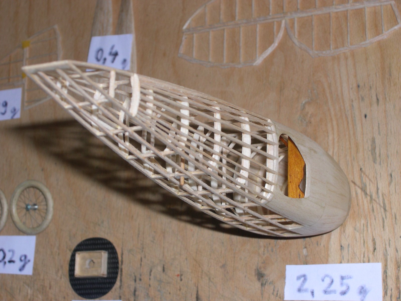 Detail kostry.Rebra-rašplova interpolacia medzi preglejkovými šablonami.Nosníky zapustené asi 0,3 pod horným obrysom,medzera doplnená pasikom balsy 0,3mm.Hrubka profilu 5%. Prvý napínací lak po celej ploche s výnimkou oblasti nosníkov.Po vypnutí dolakovana oblast nosikov tak aby lak nepretiekol k nosníku.Papier tak nie je prilepený k nosníku.