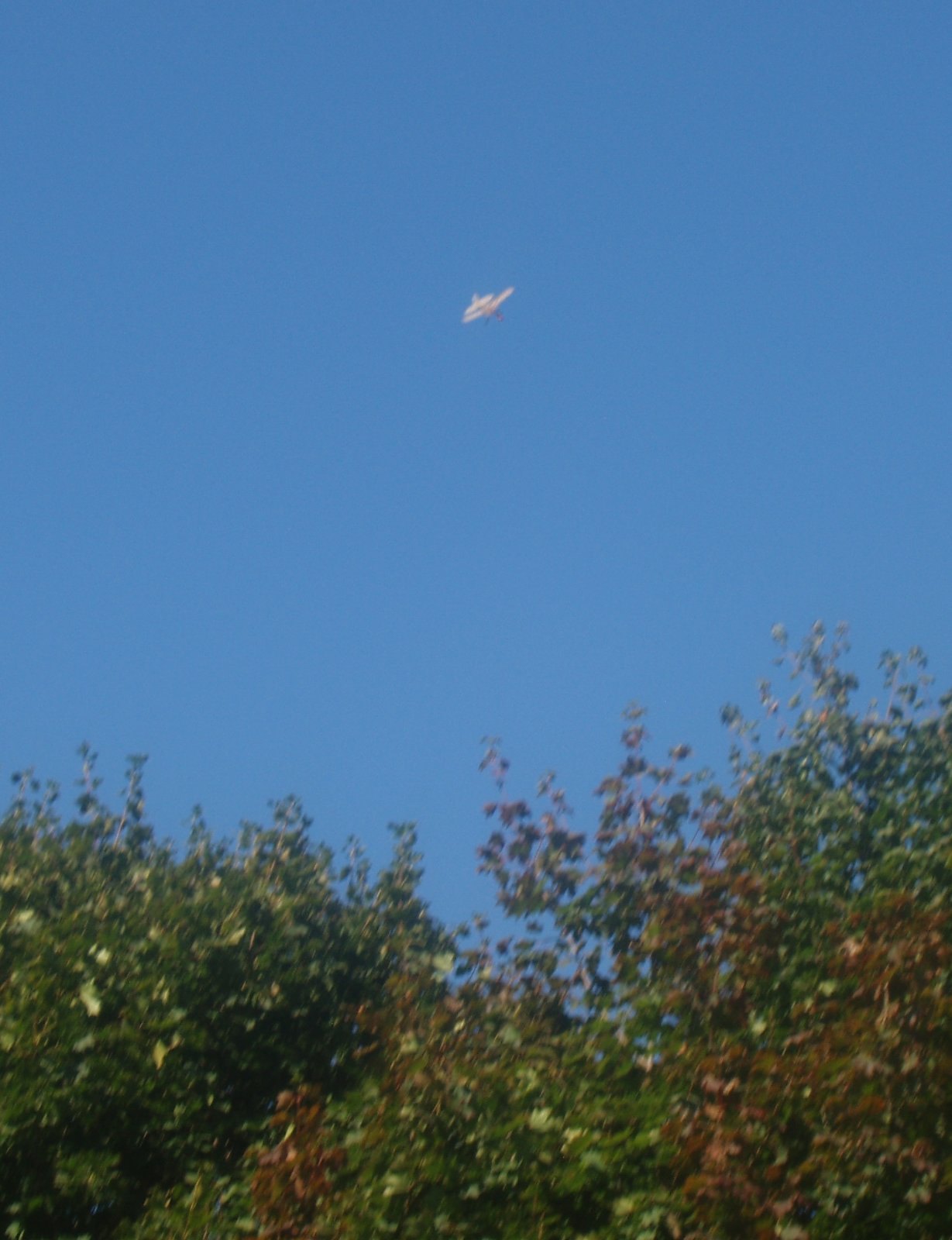 Pondělní ráno 9 hodin zatím bezvětří, beru opraveveného Grušina se ssvazkem se kterým dobře stoupal, snad až příliš a také foťák, starý Olympus, napřed fotka na lavičce nedávám pozor na vlastní stín a tak ji trochu kazím. Je mi jasné, že nemám 4 ruky a tak na pořádný letový záber potřebuji pomocníka, Zaškoluji náhodného diváka na vypouštěče modelu, zdá se, že by mu to mohlo jít, točím 1000 otáček a říkám mu, že zašal průvan od východu, musíme jít dál proti průvanu, nebo počkat, až bude úplné bezvětří. On na to, že zde nemůže být půl hodiny, takže start, ten zvládl dobře, model stoupá jako blázen, stačil jsem udělat 4 fotky, ta první v protisvětlu je perfektní záběr, ale přesvícený, druhá a třetí neostré, až čtvrtá perfektní. ale model sedí ve větvích javoru ve výšce 12m. Jdu domů pro teleskopickou tyč a staré gumy k navázání prutů, cestou řežu 5m větev a na plácku tuto napasuji na moji teleskopickou tyč a nakonec gumičkami přivážu 3 metrový prut. Celé je to monstrozní, moc to kmitá a já naslepo z venku tluču do větví, kde by snad měl být model, pak to zkouším prokličkovat podél kmene a tluču zevnitř. Již to chci vzdát a rozmontovat celé to monstrum, když mi spočine zrak na model, který neporušený leží hned vedle kmene toho jasanu. Kdy tam spadl. to jsem nezaznamenal-