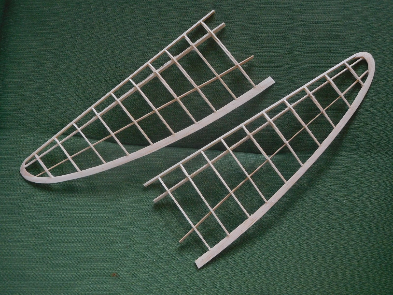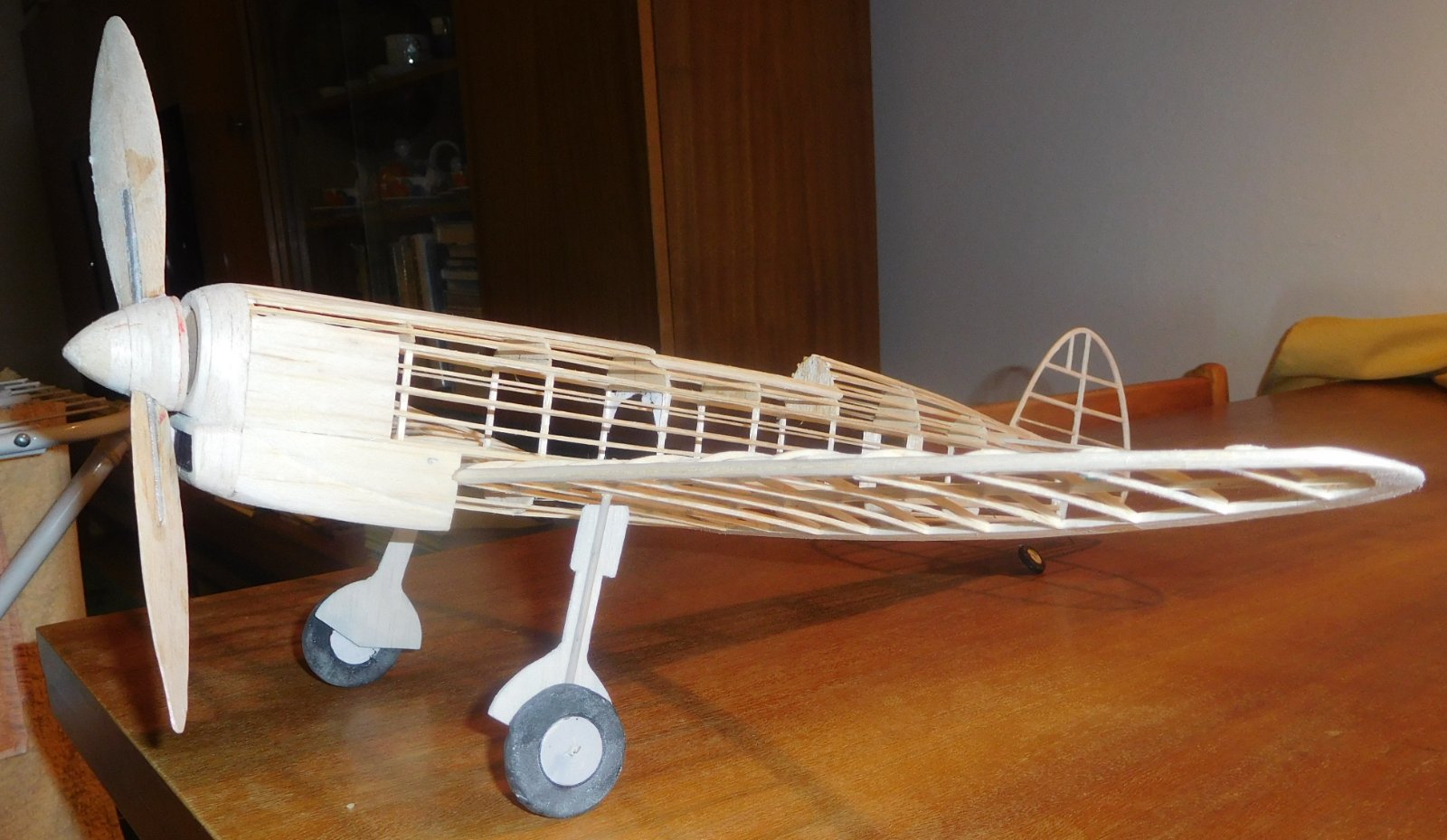 Tak kostra je skoro hotová, chybí jen kabina a dovážení. Zatím 20g, ale protože je těžiště ve 30% hloubky křídla, závěs je 140 mm za těžištěm a vrtule 75mm před ním, svazek ze 4 nití gumy TAN SS 3x1 o délce 600 mm bude vážít asi 6,5 g takže do kužele vrtule je potřeba doplnit 3 g olova, jenže není tam tolik místa. Letová by mohla být asi 33g.