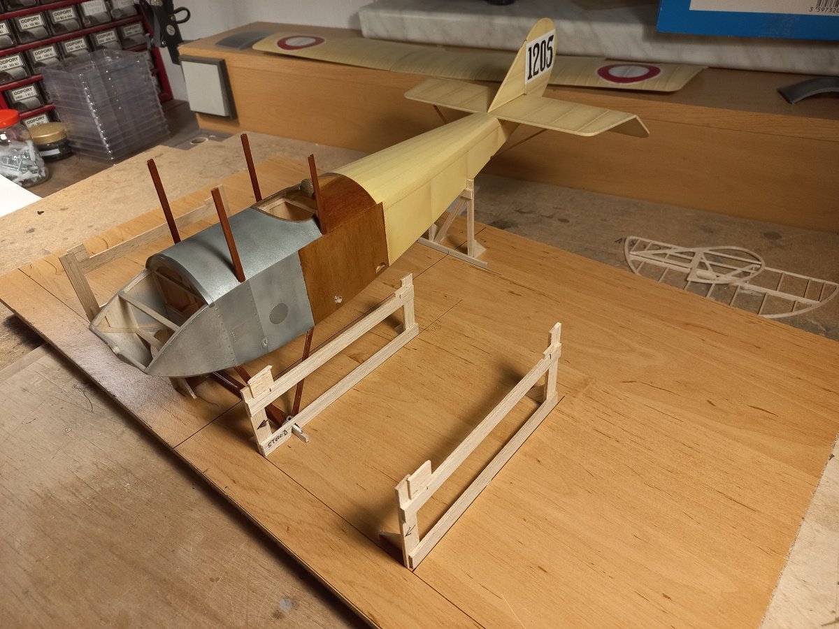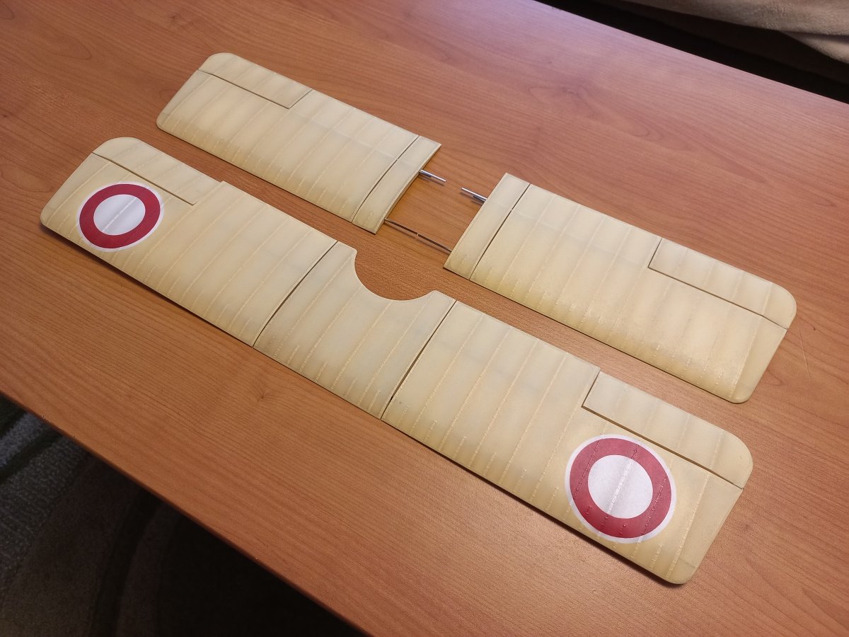 Na fotkách je vidět že už jsou osazena kormidla, u takto malých modelů jako panty zásadně nepoužívám žádné folie nebo lepící pásky ale jen pantíky typu osička-trubička. Pohyblivé plochy musí chodit naprosto volně, kontrolu lehkosti chodu provádím fouknutím, případně se musí otáčet vlastní vahou. Z obdobného důvodu nepoužívám bowdeny (pokud není zbytí - viz křidélka u F4U Corsair a He-112), ale balzová táhla na ocasní plochy a náhon křidélek torzní hliníkovou trubkou. V tomto případě jsou křidélka i na horním křídle, tak jsou spojena s dolními, torzně ovládanými, tyčkou z uhlíku opět v miniaturních pantech - jako u originálu. Je to dost náročné na přesnost ale funguje to spolehlivě - mám to ověřené na Elephantovi.