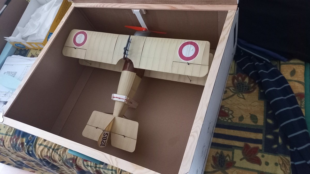 Zbývá ještě poslední a největší detail - motor. Na tom je moc práce a nechtělo se mi mrhat časem dokud se neukáže že Tabloid je letuschopný. A to se prověřilo až v podzimním Hluku. Vozit model jen tak hozený v autě na sedadle se mi nechtělo, tak vznikla přepravní bedna - netušil jsem že její výroba si nezadá s postavením jednoduššího modelu. Ale je hotová a Tabloid do ní pěkně sedne.