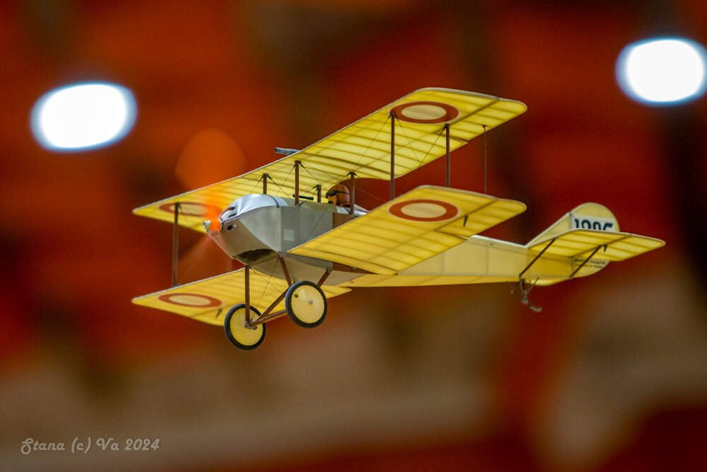 Poslední zářiový víkend se konala dvoudenní soutěž a přátelské polétání s halovými modely ve sportovní hale v Hluku a toho jsem využil k zalétání Tabloida. Ne že by letěl k mé spokojenosti hned na první dobrou, bylo ho potřeba docela dost dovážit na předek a natlačit výškovkou, ale pak už letěl. Pravda, je potřeba se s ním trochu sžít, ale letí. Celková letová váha činí 105g, což přepočtem na plošné zatížení díky velké ploše křídel nevychází vůbec špatně, ale kdyby vážil o 20g méně, jak jsem si původně plánoval, bylo by to úplně jiné polétání. Ale model je to ke všemu i dost velký, trup je bachratý, tak to asi moc jinak dopadnout nemohlo. Zde si vypomohu letovými fotkami co v hale pořídil Staňa Valnoha, já měl ruce přibité k vysílači.