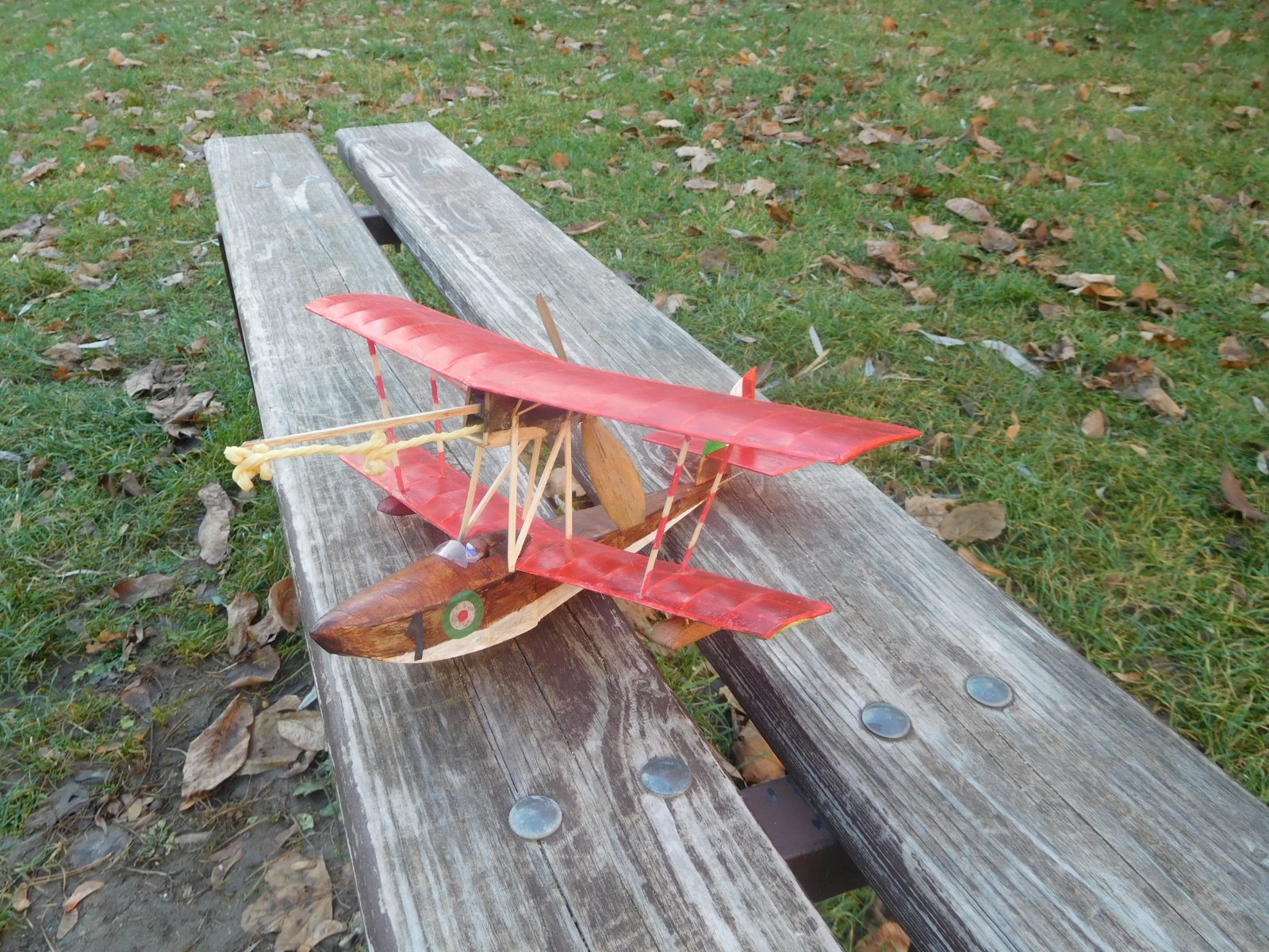Zdá se, že na těžší model s vrtulí 120/150 se svazek moc tenký. Takže nový svazek z gumy TAN SS 01/2015 3,6 g/m p délce 320 mm a váze 2.3g N max 1380 ot. , byl o 20 mm zkrácený motorstic a u žehličky nakroucen negativ na koncích pravýcch stran křídel. 3.12. v poledne bylo pod mrakem 3 st. C a vlhko, bohužel vlhko způsobilo zvlnění potahu z kondenzátorového papíru křídel a tím téměř ztrátu negativů. První natočení na 500 otáček dalo velký moment, po startu model vystoupil do výšky 2,5m, ale pak přešel do velmi úzké levé zatáčky a rychlého klesání, opět let cca 10s a značný zbytek otáček, na něj let v klesavém okruhu o průměru 8m. Po vytočení svazku zkouším klouzavý let a ten je dost strmý, model se zdá těžký na nos, doma další zkrácení motorsticku o 7 mm a natažení VOP. Bude se čekat na lepší počasí. Zatím doplňuji podklady o barvy z internetu.