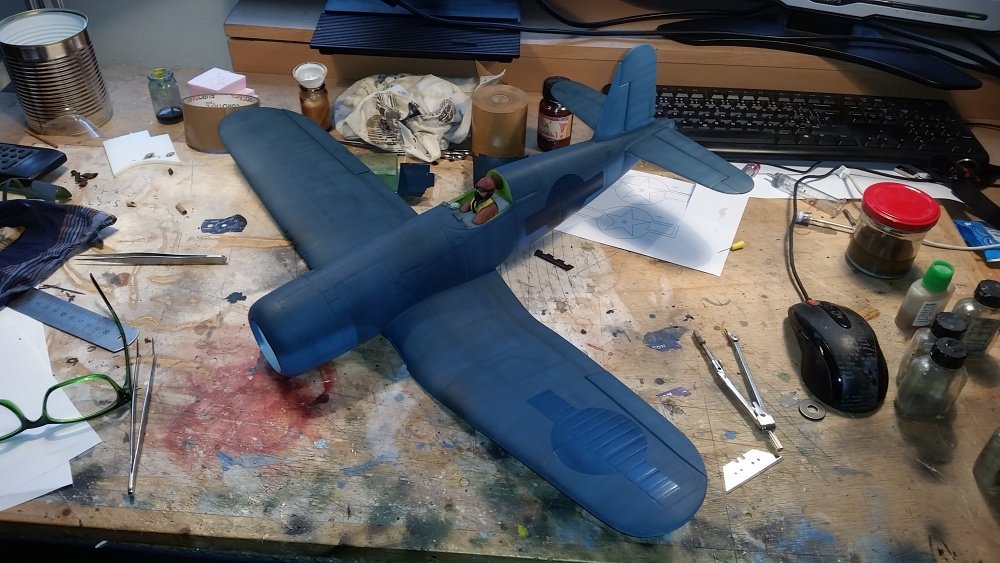 V rámci vymetání kostlivců ze skříní jsem se zase pustil do Corsaira. Původní nápad na celomodré zbarvení jsem zavrhl s tím, že udělám Kepfordům profláklý Corsair, ten druhý v pořadí. Je na něj totiž dostatek dokumentace, což ovšem neznamená že by byla jednoznačné