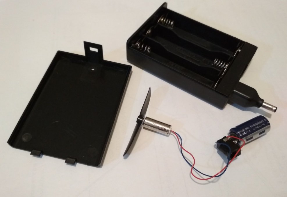 Kdo se bude chtít zapojit, má možnost za opravdu pár peněz přijít k celé výbavě, tzn. ss motorek s vrtulkou, kondenzátor a nabíječka po vykuchání z gumového házedla z Číny, cena od 60 Kč, odkaz na eBay zde: