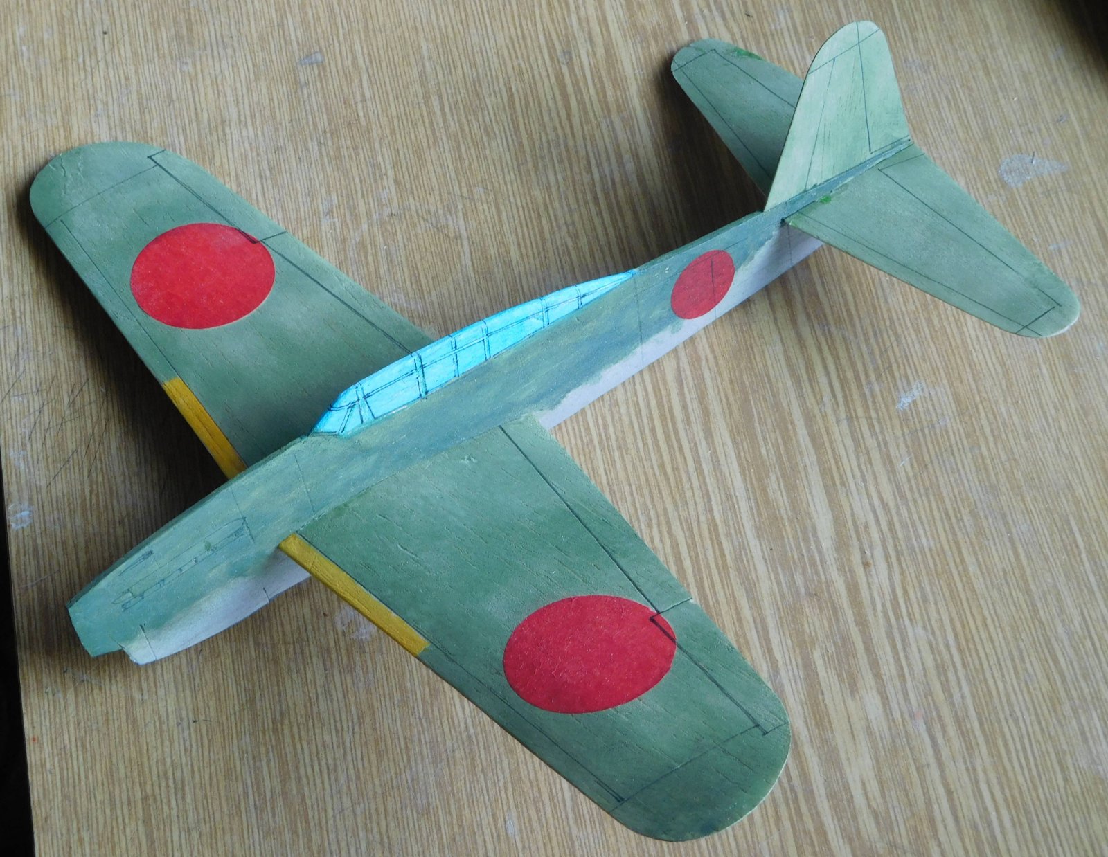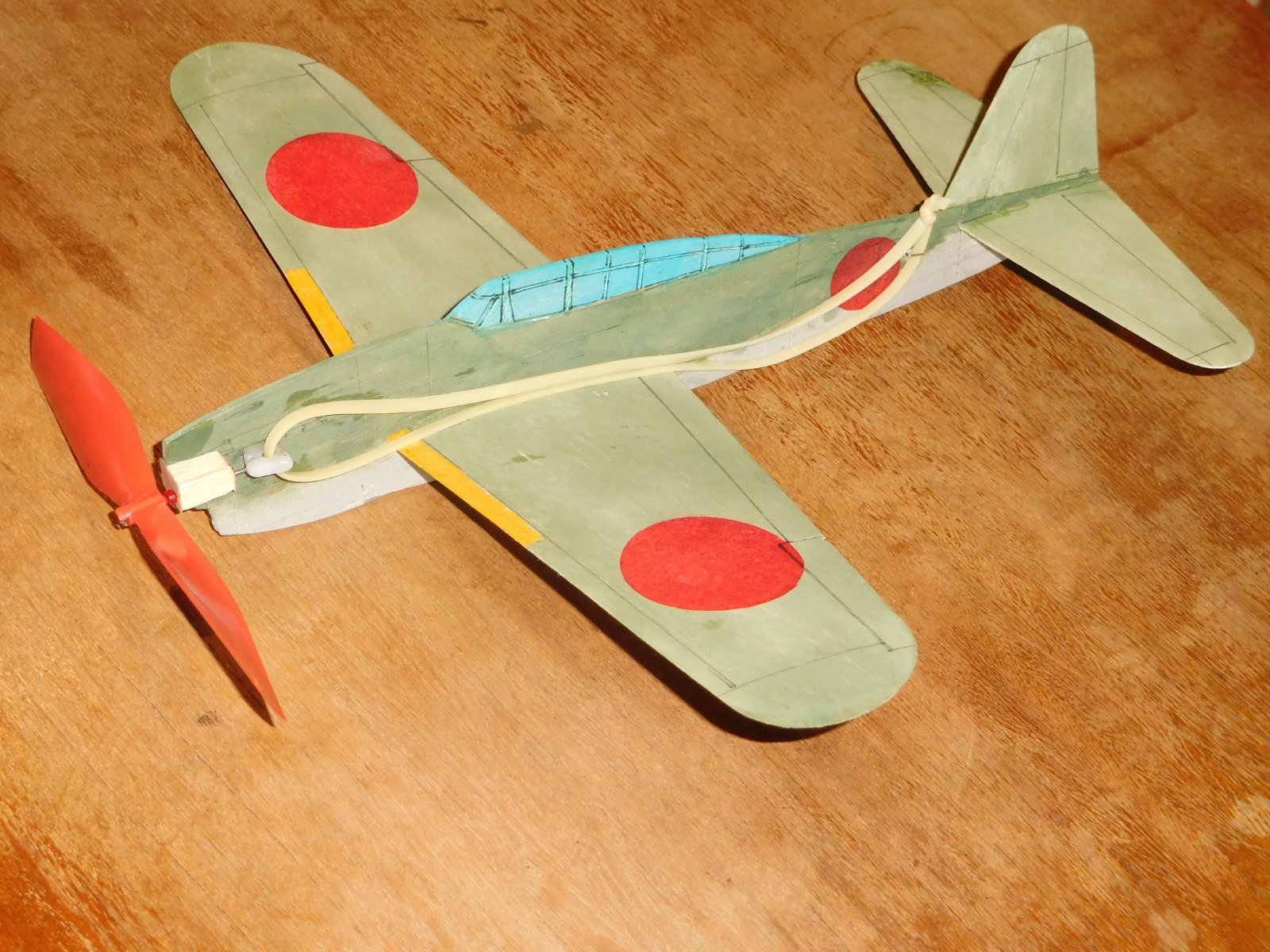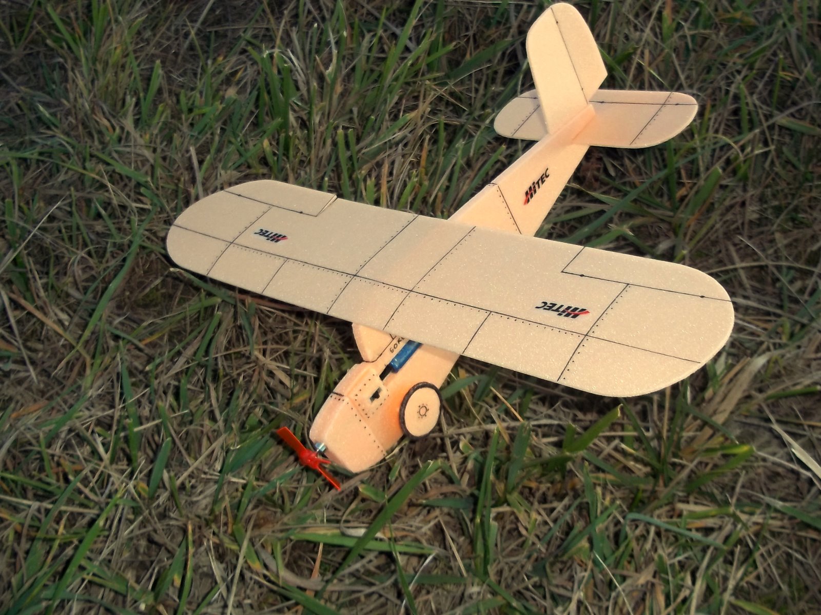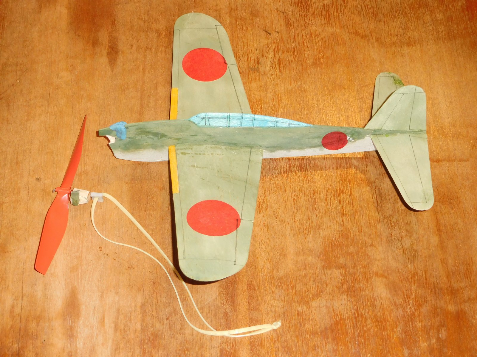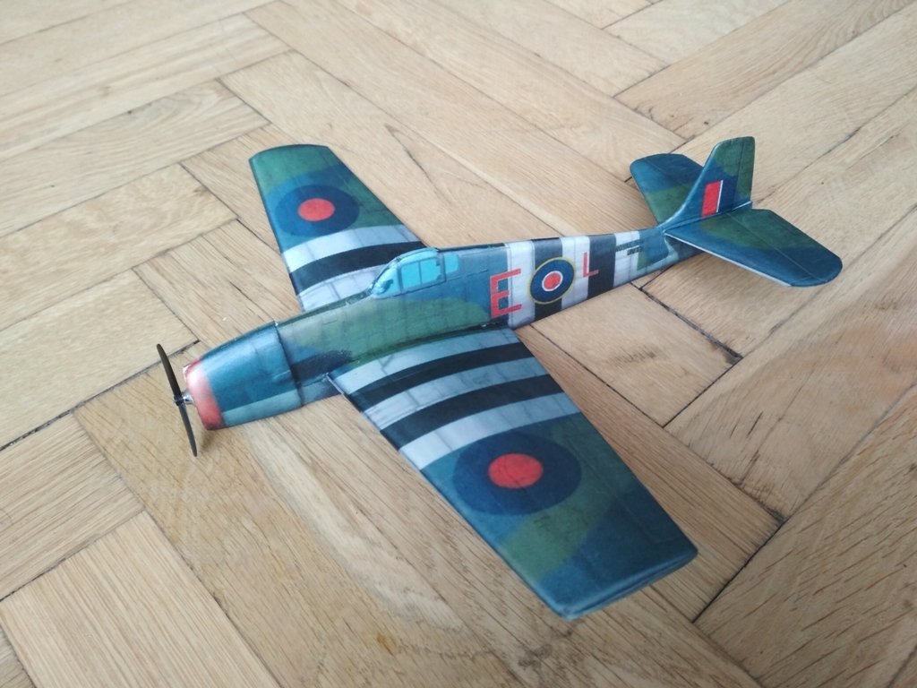 Vzhledem k použité miniaturní vrtulce v čínském setu z odkazu jsem si záměrně jako předlohu vybral letoun bez vrtulového kužele - Hellcata. Tím ale nechci shazovat předlohy, které kužel mají, jen mi to přijde líbivější, byť i zde miniaturní vrtulka působí směšně. Jelikož má zakoupený čínský model motor na pylonu v tlačném uspořádání, po kanibalizaci elektroniky je nutné ho přepólovat a zároveň otočit na hřídelce vrtulku, aby táhla. Důležité upozornění: vrtulka je levotočivá! Pro ušetření problémů při zalétávání doporučuji kvůli tomuto faktu létat VPRAVO-VPRAVO. Díky poměrně vysokým otáčkám při startu jinak model při seřízení VLEVO-VLEVO končí v levé motorové šturcce.