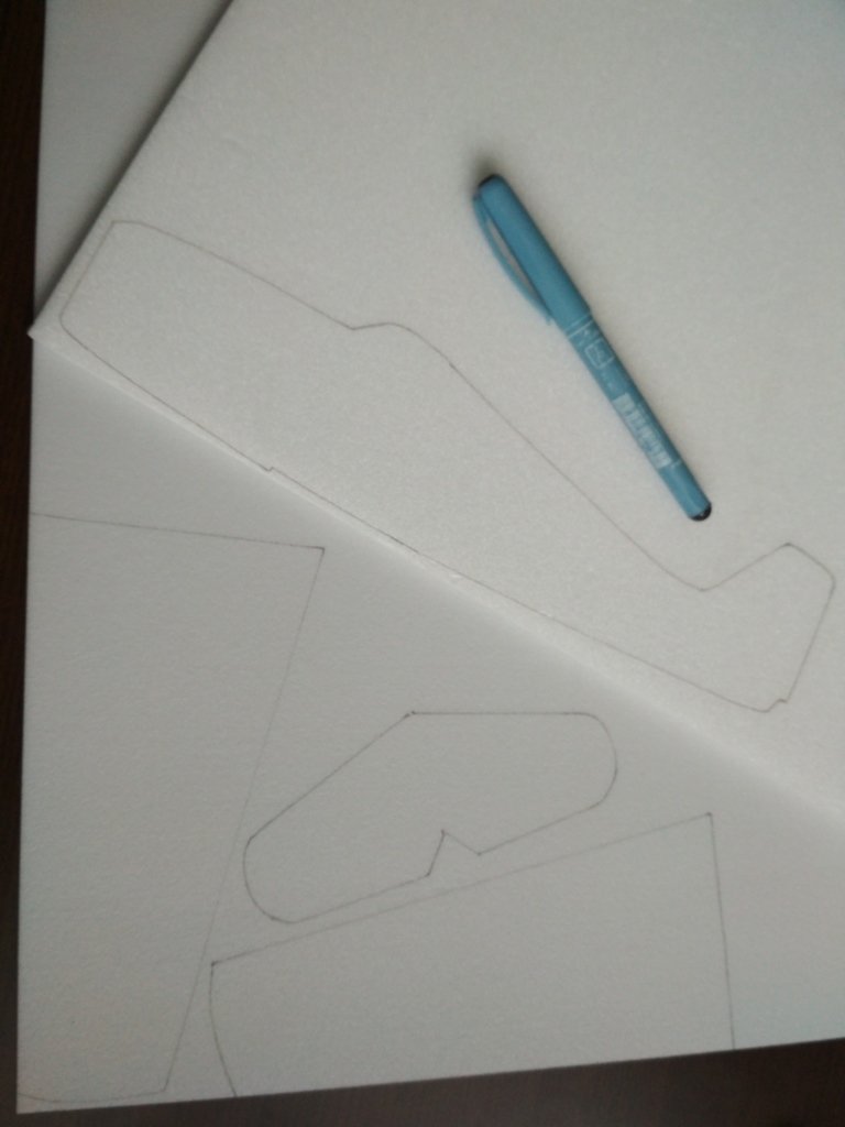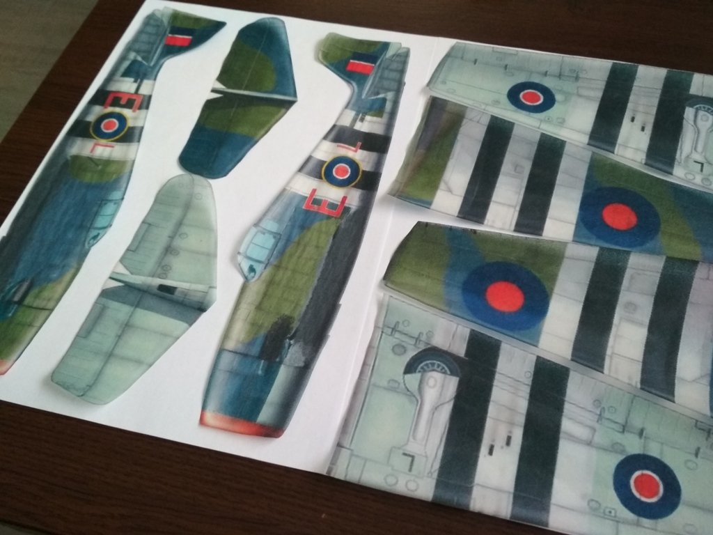 Patřičně nazmenšované obrysy předlohy jsem pomocí papírových šablon přenesl na Depron. Trup na 7 mm, křídlo a výškovku na 2 mm silný. Kdo tyto slabé nemá, zbrousí si ze 3 mm nebo použije balzu. Vše žiletkou vyříznu. Trup má kvůli odlehčení zadní části v půdorysu tvar klínu, tzn. je směrem dozadu zbroušen až na tloušťku 2 mm a po obvodu je zakulacen (není nutné). Profil křídla v této velikosti modelu moc neřeším, pouze ho mírně několikrát prohnu přes hranu stolu do požadovaného klenutí. Určitě neuděláte chybu, když profil bude pouze rovná deska, let bude rychlejší, model více nastoupá. Jelikož jsem líný a nechtěl jsem se moc trápit s následnou povrchovou úpravou, pomohl jsem si barevným kamuflážním schematem ve vysokém rozlišení (oficiálně zkopírovaným